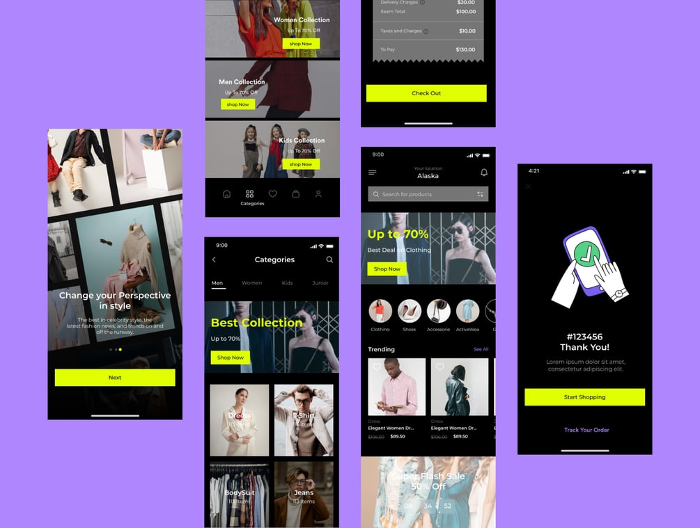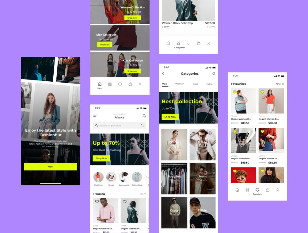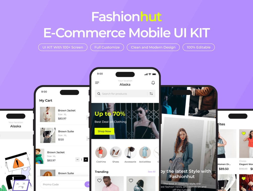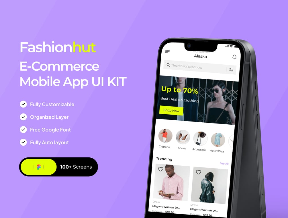 Fashionhut e-commerce is a modern e-commerce app UI kit featuring over 100 high-quality screens, including 50+ light modes and 50+ dark modes. This UI kit provides a consistent and fully customizable look and feel, allowing you to tailor it to your specific needs. It offers carefully organized layers, pixel-perfect designs, and access to free fonts and essential components to simplify your design process.
