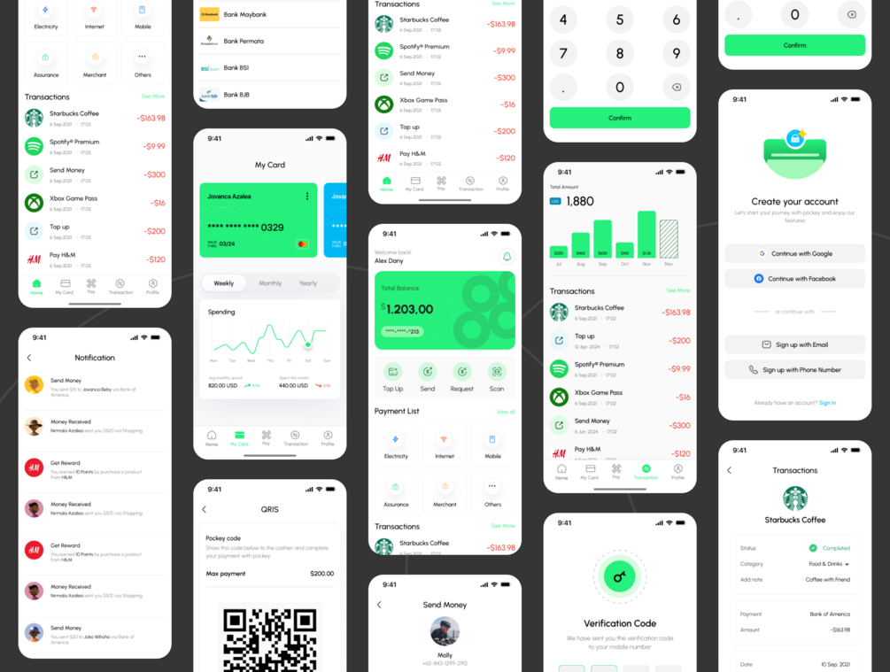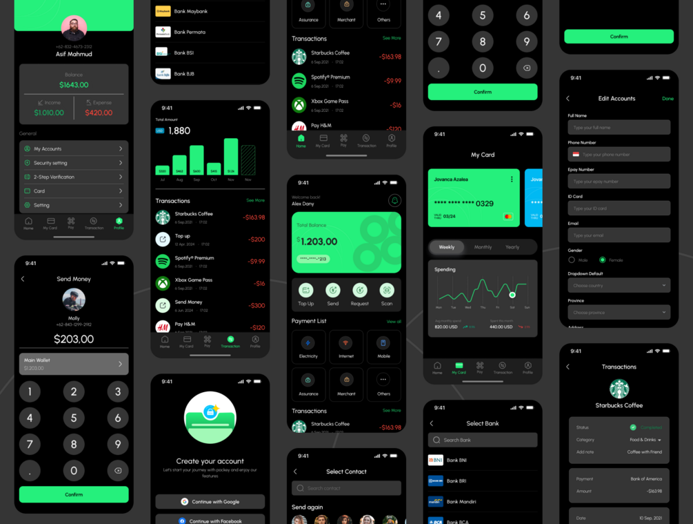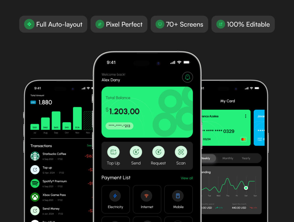 Mycash Finance Banking is a modern finance app UI kit featuring over 70 high-quality screens, including 35 light modes and 35 dark modes. This UI kit provides a consistent and fully customizable look and feel, allowing you to tailor it to your specific needs. It offers carefully organized layers, pixel-perfect designs, and access to free fonts and essential components to simplify your design process.